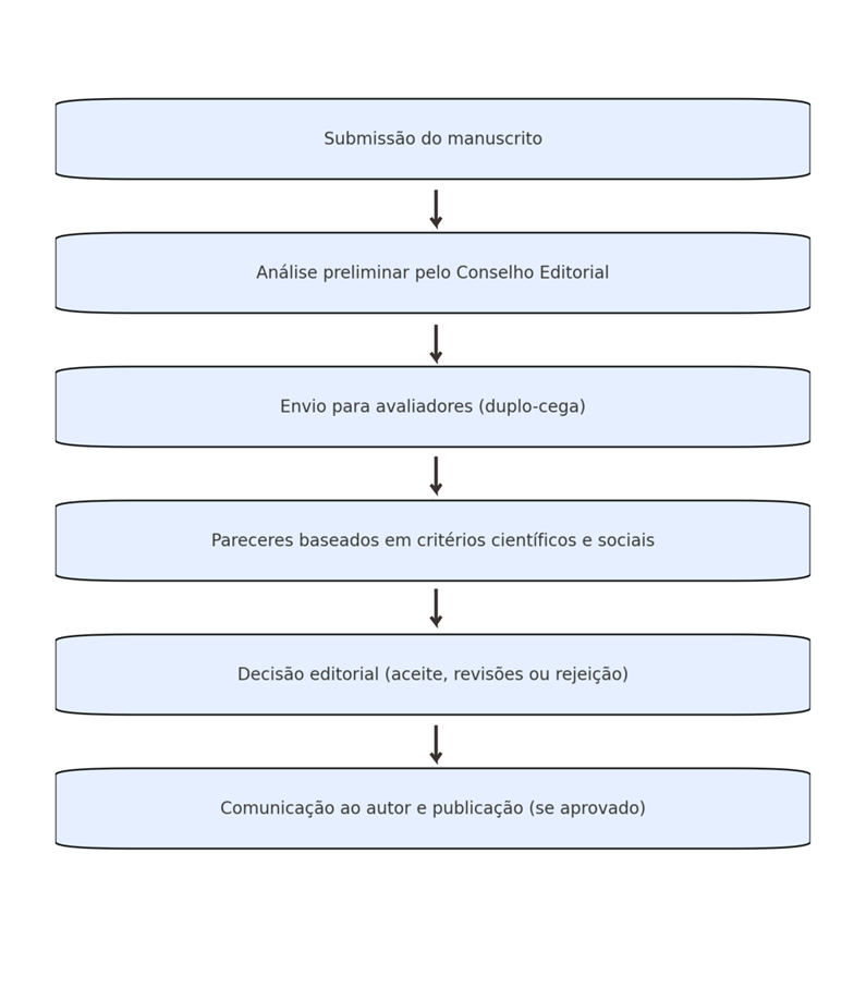 Todos os manuscritos são avaliados preliminarmente pelo Corpo Editorial, que verifica sua adequação às normas da revista, alinhamento à missão institucional, relevância científica e potencial de impacto social. Trabalhos fora do escopo ou que não atendam aos padrões mínimos de qualidade são rejeitados nessa fase.